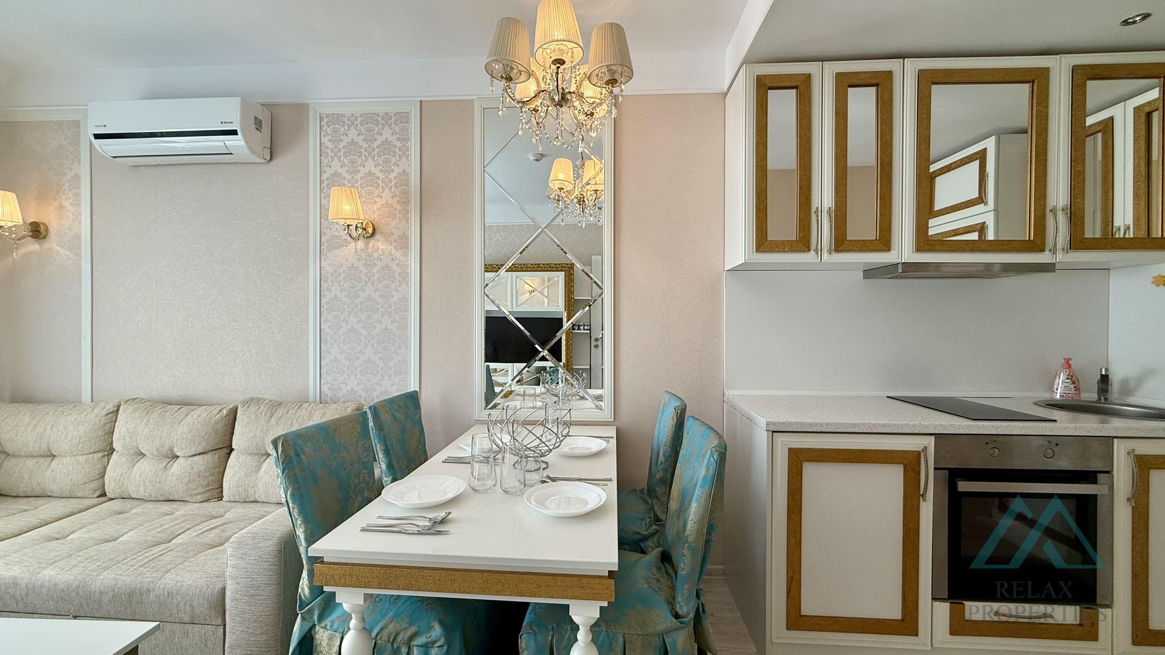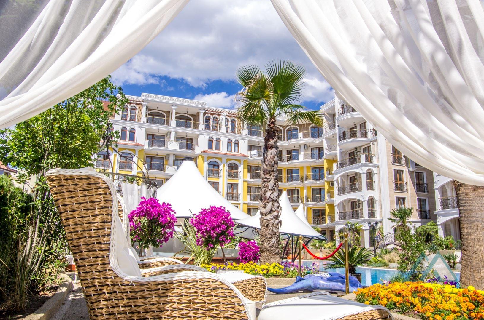 Tento exkluzivní celoroční komplex je díky svému jedinečnému designu, luxusním službám a krásně upraveným pozemkům jedním z nejoblíbenějších a nejvyhledávanějších v Slunečném pobřeží. Byt je kompletně zařízený na vysoké úrovni a připraven k okamžitému užívání.