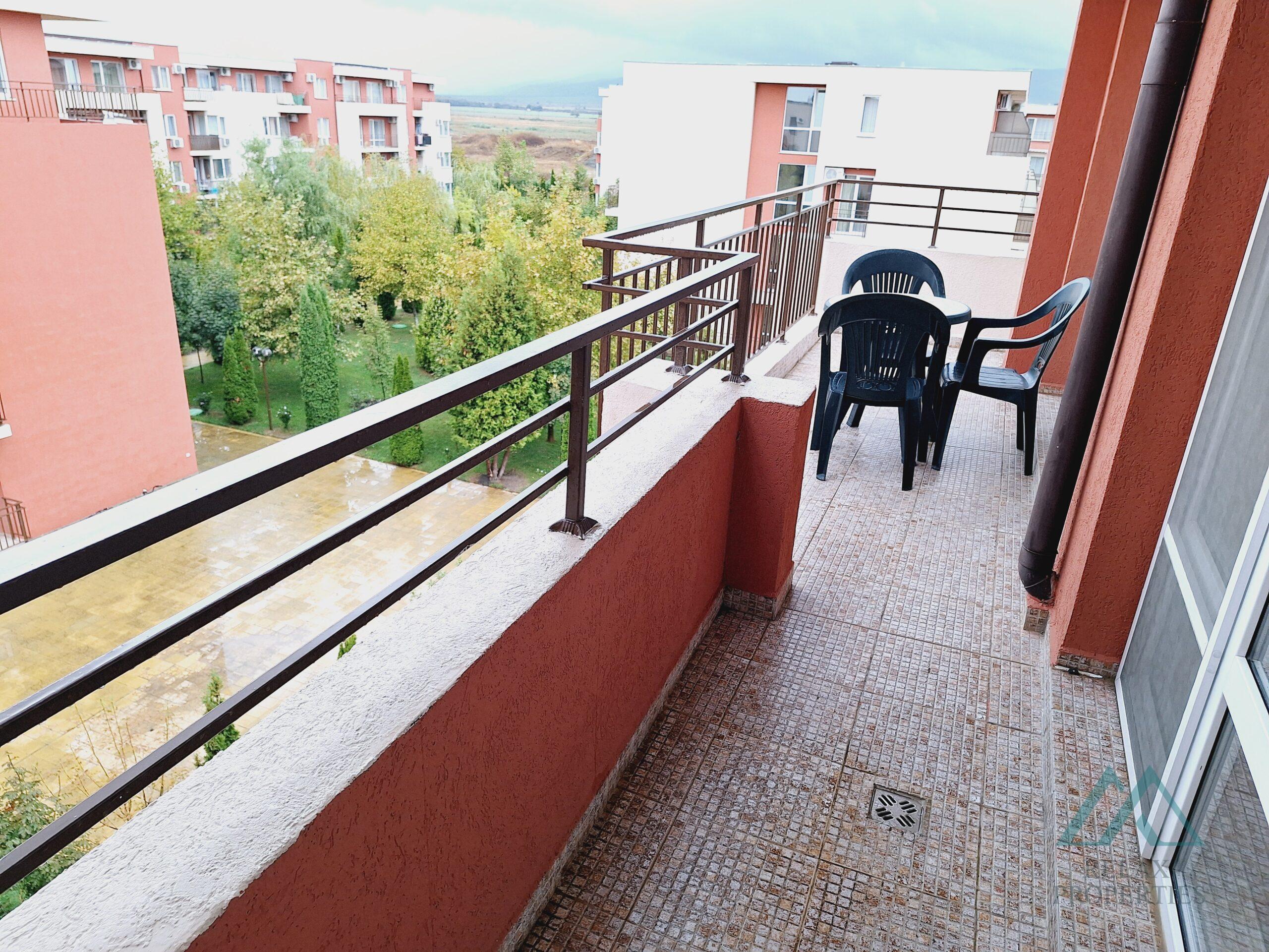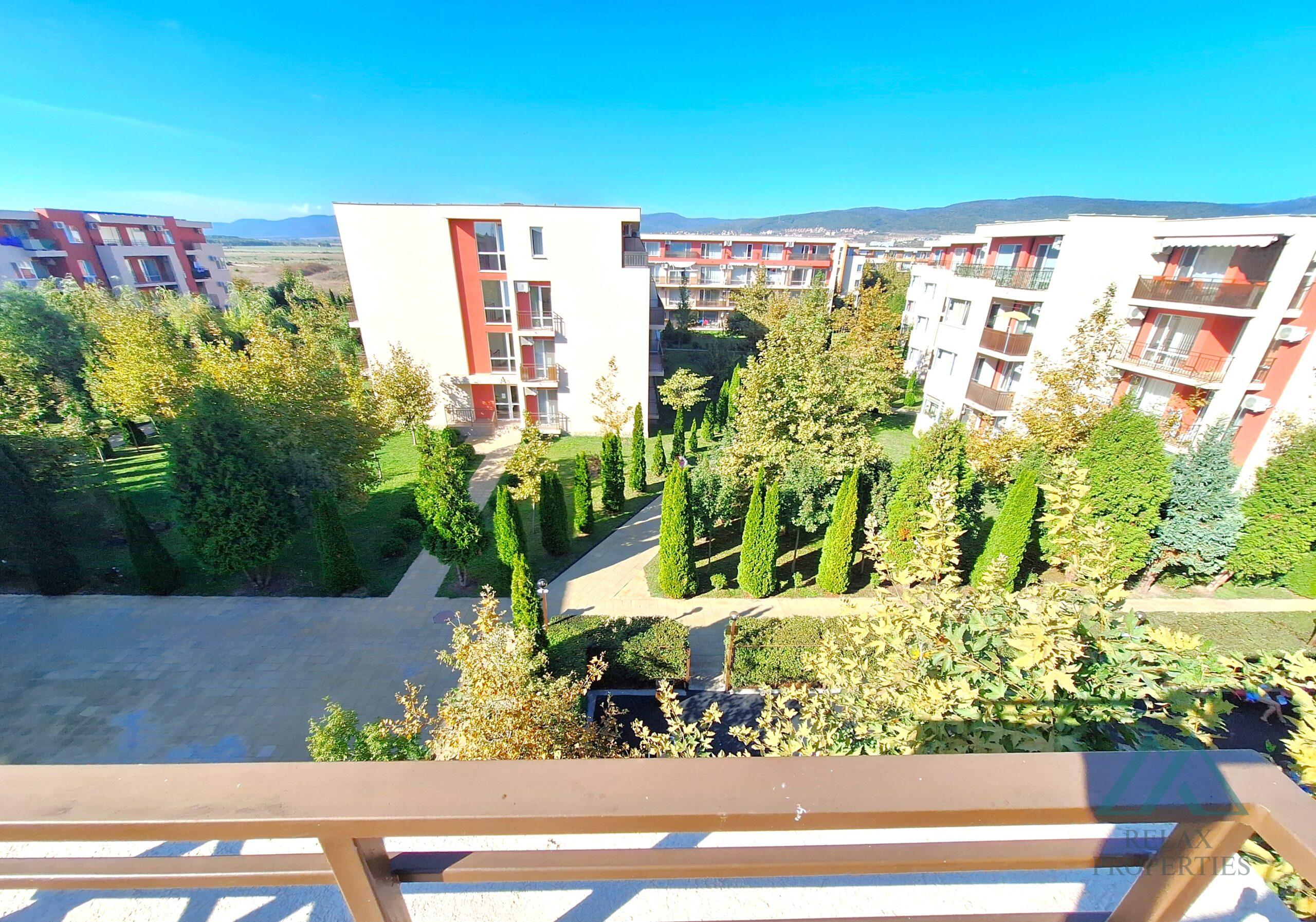 Referenční číslo: B_3485 Nabízíme k prodeji prostorný 2-pokojový byt o rozloze 68 m² v komplexu Holiday Fort Club, letovisko Slunečné pobřeží, Bulharsko. Byt se nachází ve 4. – nejvyšším patře a má velkou terasu s krásným výhledem do zahrady.