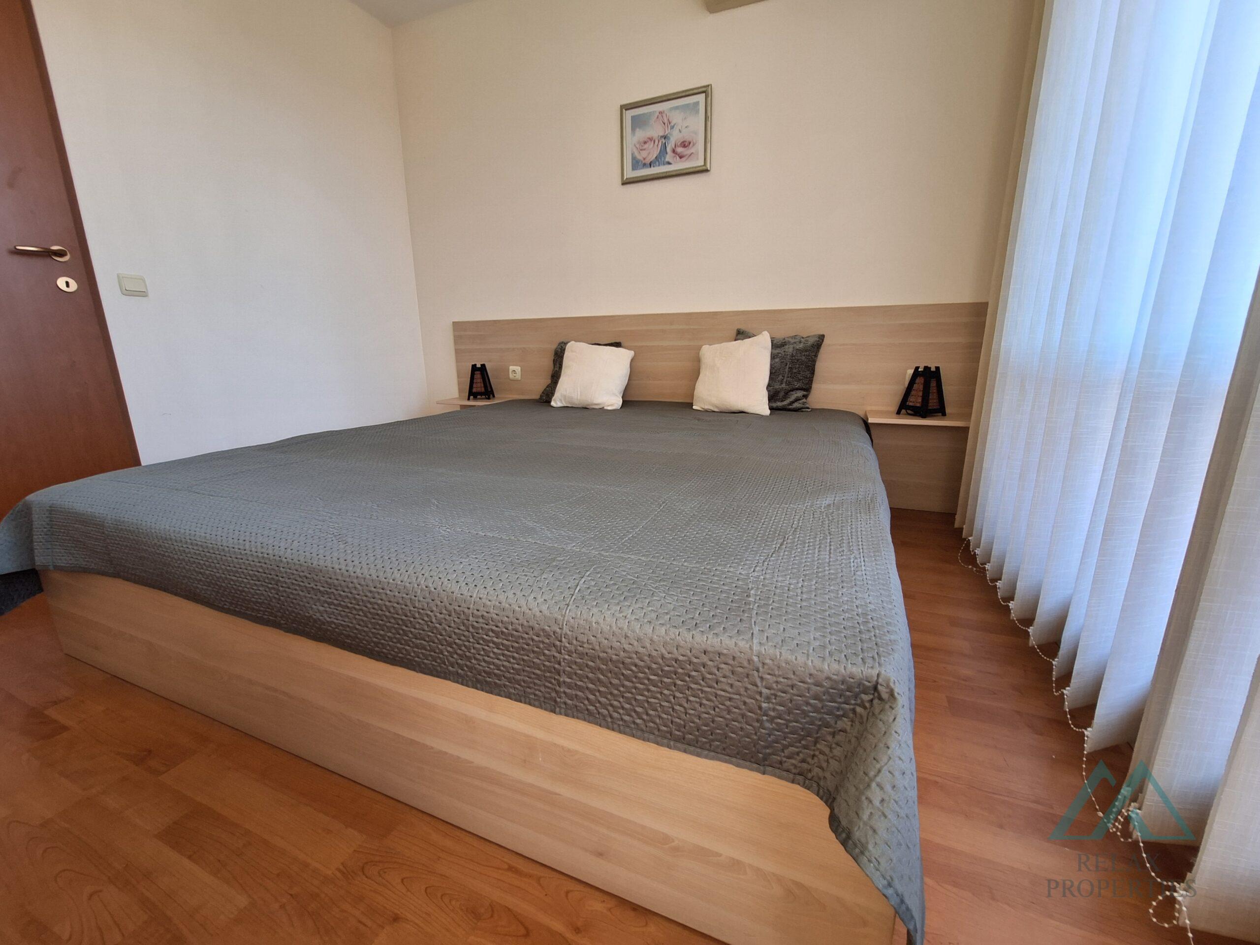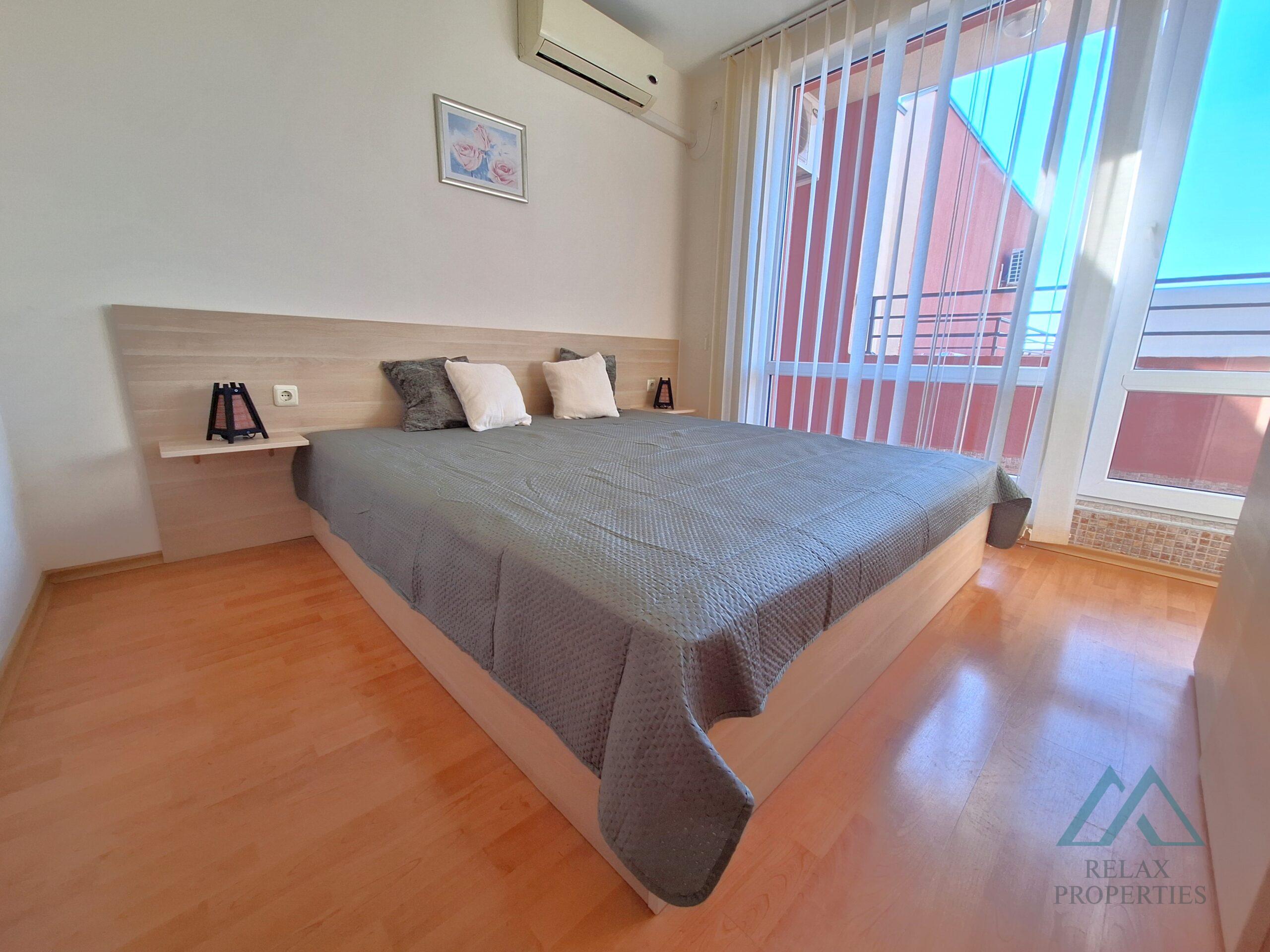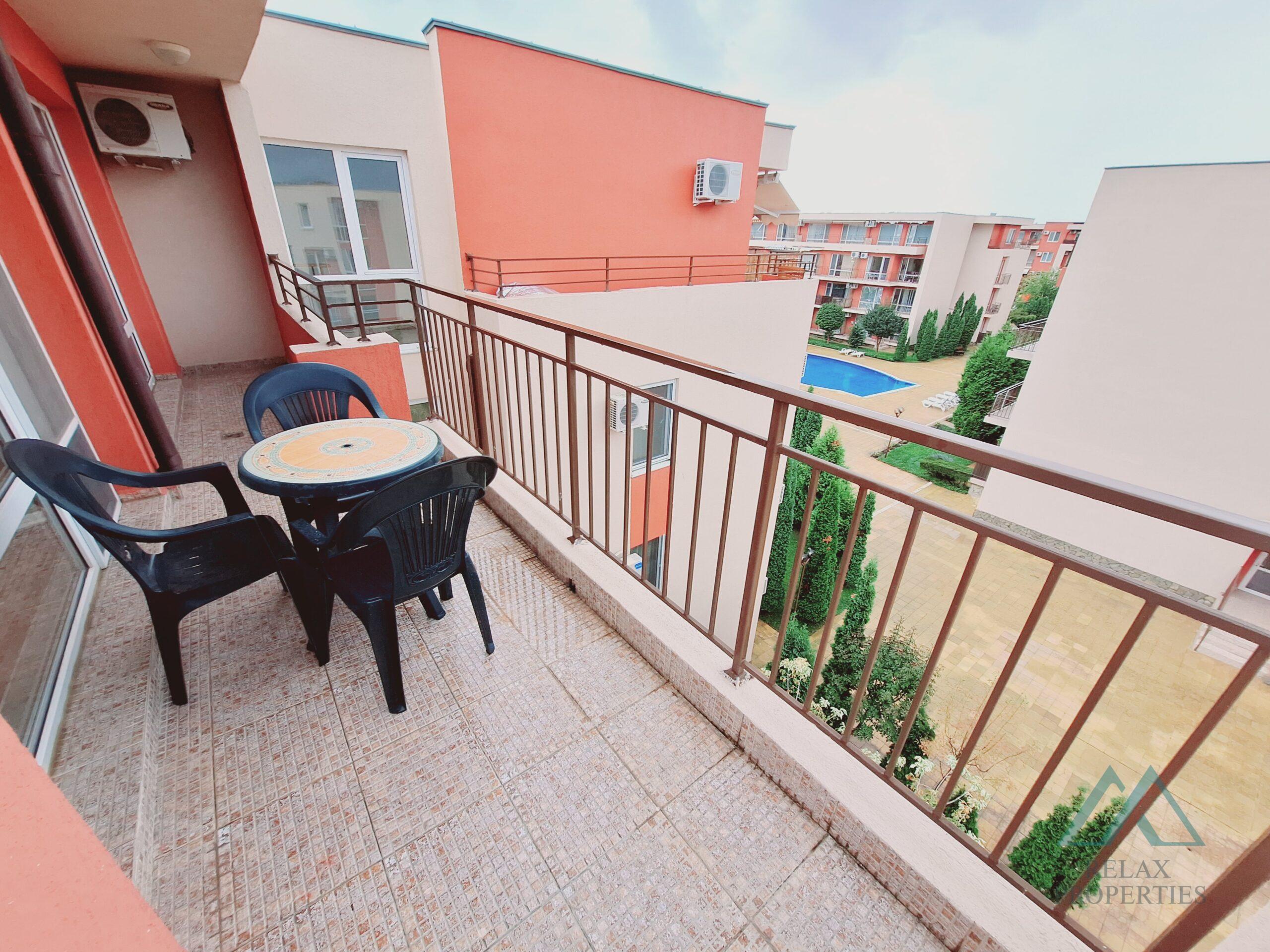 Byt se prodává kompletně zařízený a vybavený – kuchyň se spotřebiči, rozkládací pohovka, jídelní stůl se židlemi, skříně, TV a klimatizace, manželská postel a šatní skříň. Koupelna je vybavena sprchovým koutem a bojlerem. Nemovitost je vhodná k trvalému bydlení nebo k pronájmu během prázdninové sezóny. Komplex se nachází v blízkosti největšího aquaparku na pobřeží Černého moře a pouze 900 m od písečné pláže.