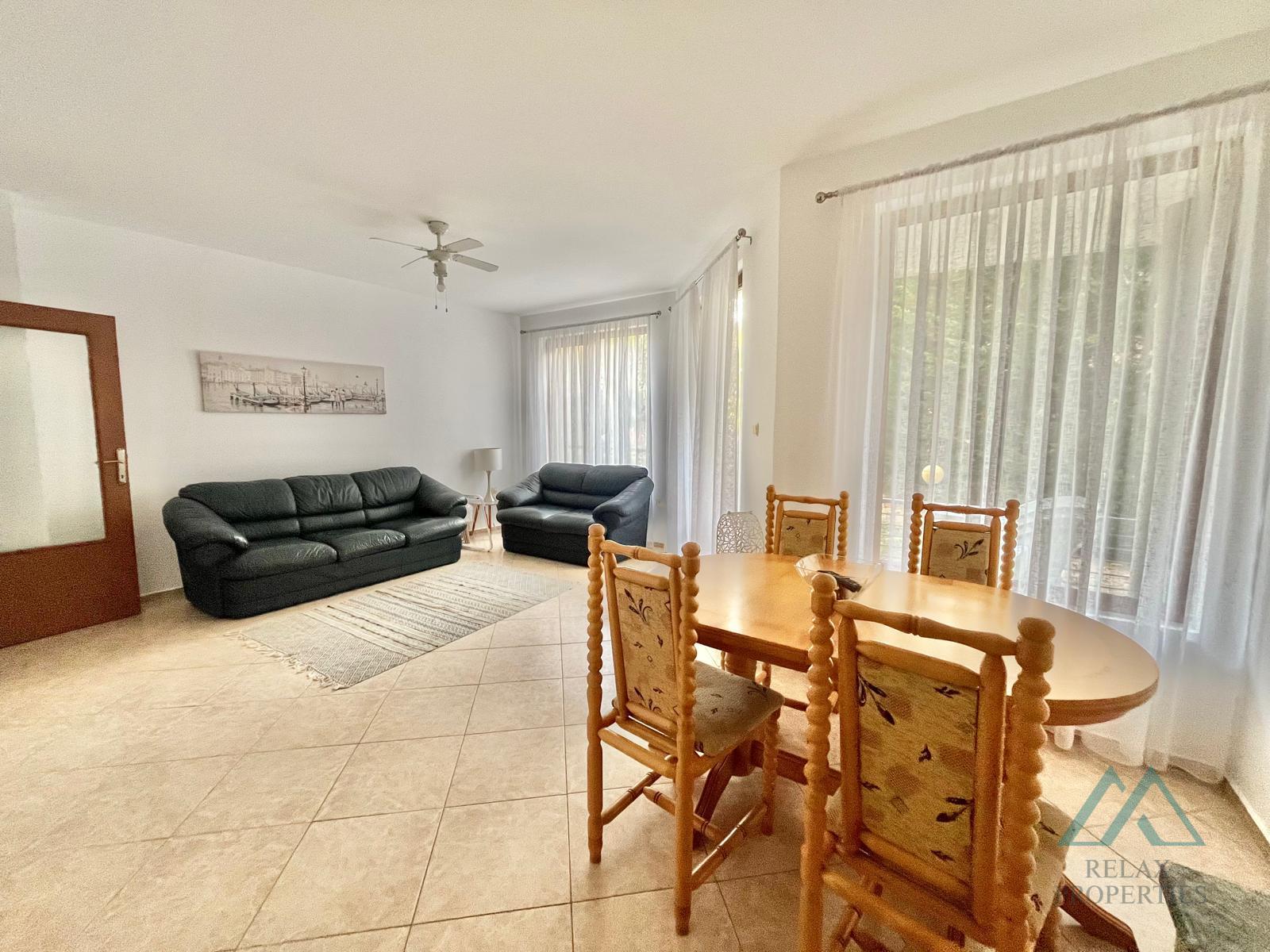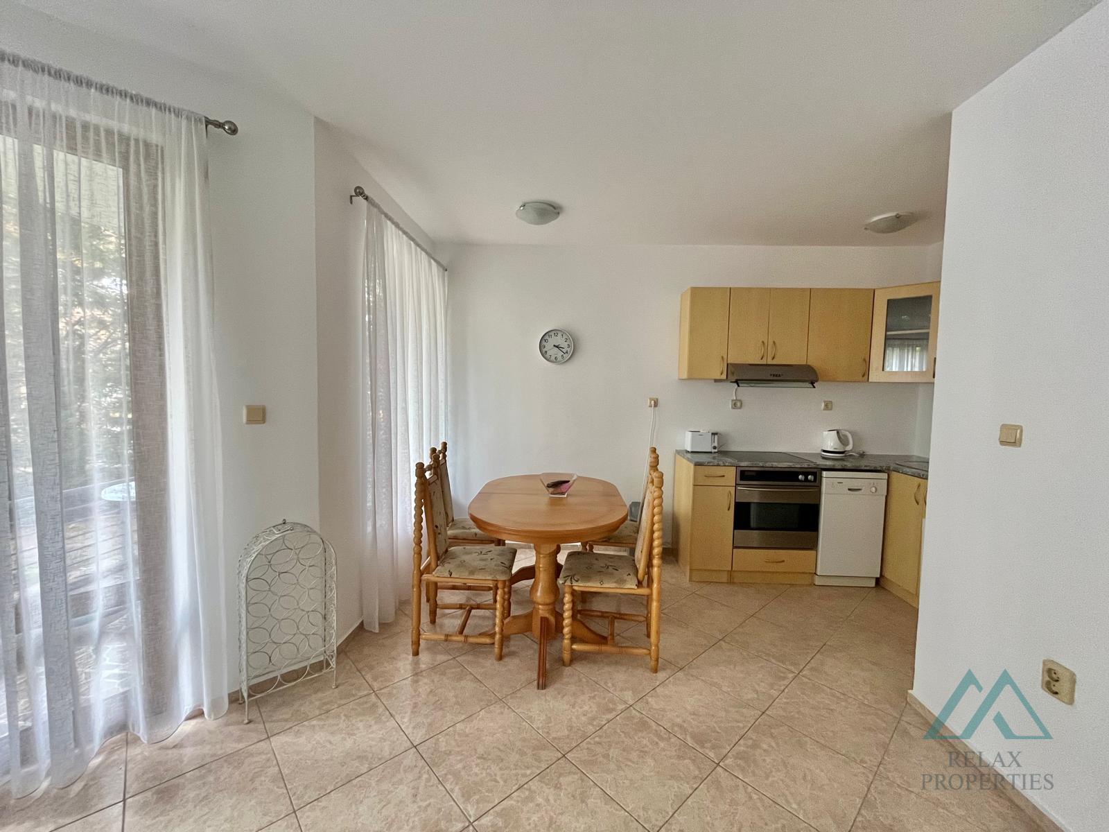 Roční poplatek za správu a údržbu: 300 € Byt je plně zařízený a ve výborném stavu, připravený k okamžitému užívání. Komplex je oplocený a nabízí bezpečné prostředí s bazénem, upravenou zahradou a soukromým parkovištěm. Pláž je jen pár kroků od komplexu.