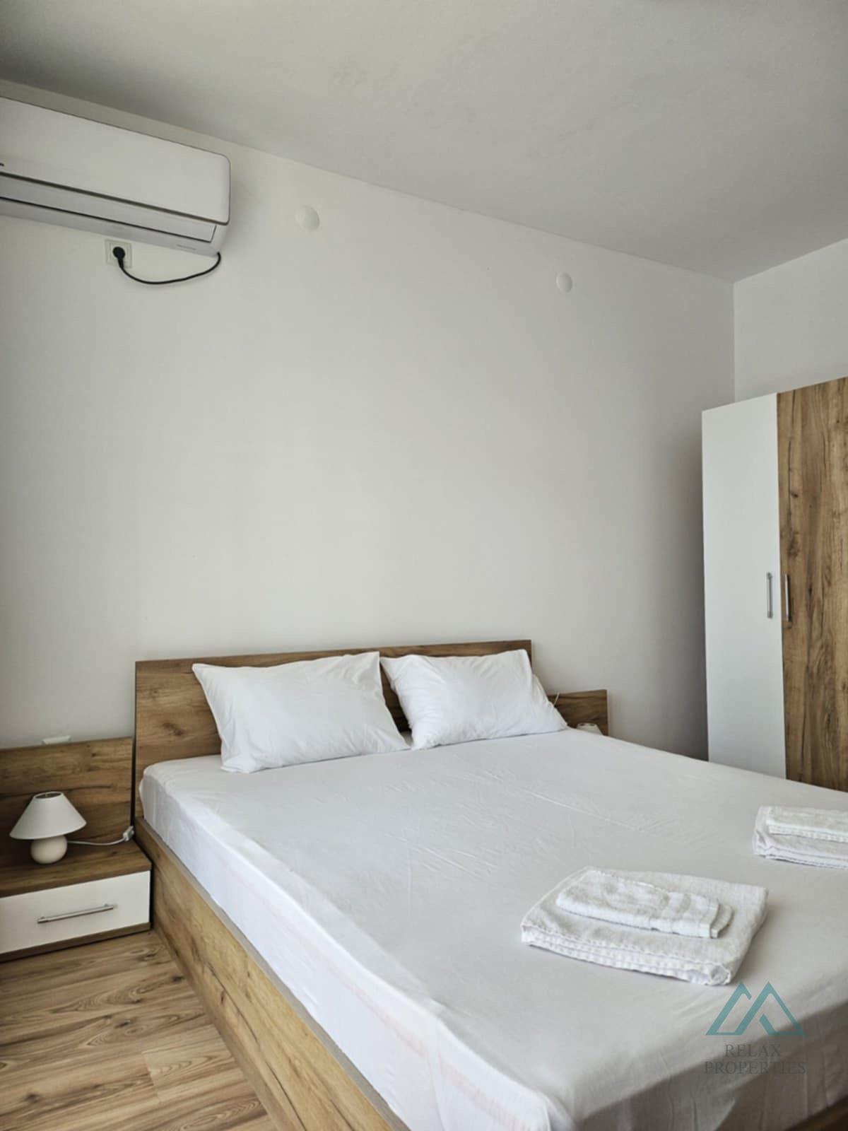 Byt má celkovou plochu 67 m² a nachází se ve zvýšeném přízemí. Dispozice se skládá z: předsíně, obývacího prostoru s kuchyní, samostatné ložnice, koupelny se sprchovým koutem a toaletou, terasy s posezením. Byt má částečný výhled na moře. Nemovitost je plně zařízená a prodává se jako taková. Toto vybavení je již zahrnuto v ceně. Je vybaven klimatizací, plochou TV, plně vybavenou kuchyní, plně vybavenou ložnicí s velmi pěkným nábytkem.